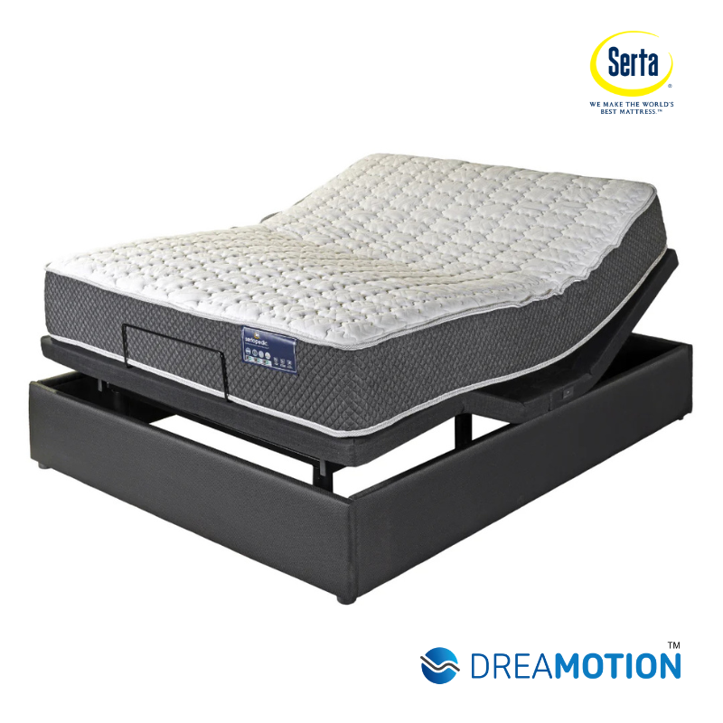 The Serta mattress is fully compatible with the Dreamotion™ adjustable base and engineered to flex without compromising support. Features include a wireless remote with memory settings, under-bed lighting, integrated USB Type-C charging ports, and pillow-free positioning for optimal head and neck support.